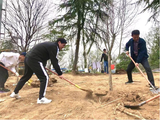 在场师生党员,热情饱满,干劲十足,分工协作。有的培土,有的围堰,有的浇水。各个环节衔接有序,配合默契。植树现场一派热火朝天的景象。最后,全体人员认领树木,并合影留念。